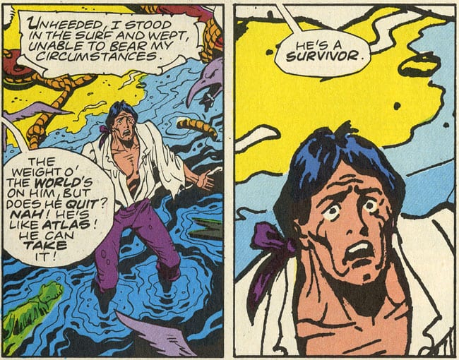 MOORE: It certainly is, you clever cultured boy. For those cultureless people in the audience, Bertolt Brecht, Bert as I call him, wrote The Threepenny Opera with Kurt Weill. It’s a magnificent story set around the coronation of King Edward in England. It’s where the song “Mack the Knife” comes from, and it was originally a very nasty bloody song, whatever Bobby Darin did with it. One of the prostitutes in the story, a girl called Jenny, sings a song called “Pirate Jenny.” She works in a hotel, scrubbing floors, and in her head she’s thinking about all these guys smoking cigars who’re sneering at her, and there’s a black freighter waiting out at sea and one day it’s going to come into town with guns firing from its bow, and the pirates are going to teem off the ship and run through the town, and they’re going to be piling up the bodies. It’s this horrible black vision of this ship coming in with a skull on its masthead. Everything’s still in the town, with everyone wondering what’s going to happen, and then this prostitute says, “I step out, looking pretty in the morning with a ribbon in my hair, and a cheer splits the air.” In her dream, she’s the pirate queen, and they’re going to kill all the rich people and they’re going to say to her, “Shall we kill them now or later?” and she’ll say, “Kill them now.” At the end she goes out on the Black Freighter. It’s such a powerful image, this death ship coming in, and in the Watchmen another sort of death ship is coming in — the nuclear war that’s looming. The idea of death that you can do nothing about just coming in on the tide just seemed to tie in so nicely that I thought, “I’ll rip that off. I’ll take the ‘Black Freighter’ and bring it into the Watchmen as one of the pirate comics,” using it as a counterpoint.