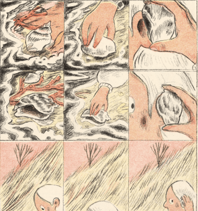 His layouts are imaginative. They proceed with stately regularity or careen across the page. Border lines may contain his panel or dissolve and let them flow. His backgrounds are generally pure white, but shadows and darkness swoop in and descend when fear and horror are to be conveyed. Basically he renders what he has seen or been told, but on occasion, as in a ghastly depiction of vultures feeding on corpses, he accesses the grotesque in summary of history’s march.