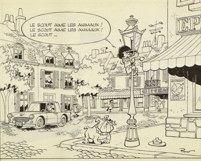A pint-size existential loner in a beret, Benoît speaks and thinks like a grade school kid. Yet he is shunned by all the other children. He also has no family and lives alone in an empty house. As with several of Spirou's new series, this was not exactly boilerplate fare for youngsters. Yet Charles Dupuis loved it and he demanded to publish both Benoît and Poussy. With typical stubbornness, Peyo then created a third story for Le Soir. This one starred two adolescents, Jacky and Celéstin, but the art was handled by Will Maltaite.