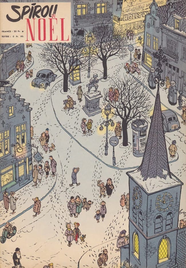 Eventually workers at World Press tried to unionize (as a result, they were fired on the spot). But early on no one had time to think about conditions. Instead, propelled by shared ideas and always-urgent deadlines, they turned Spirou into a little world of their own. It was this universe which made Peyo's art possible and his career was tied to its human circuitry.