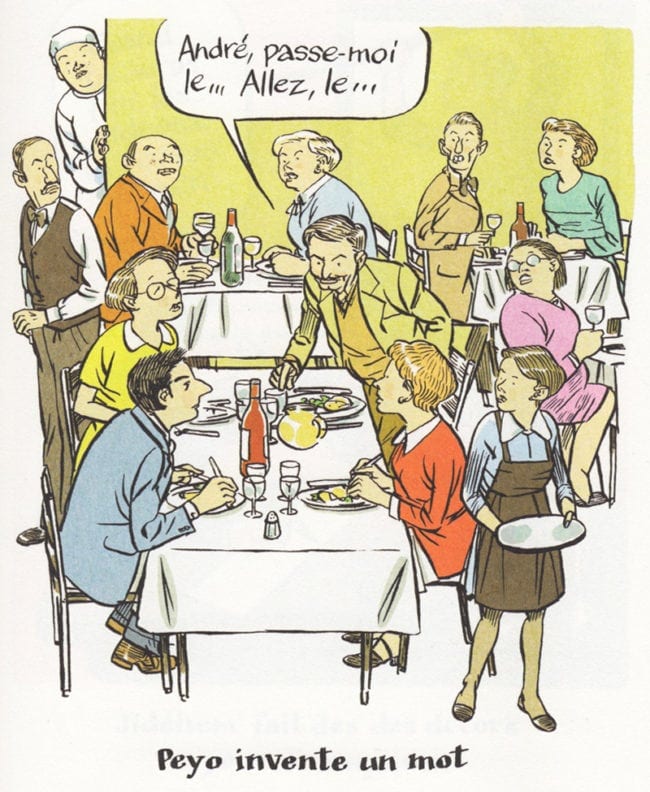 Once, on a summer holiday, the Cullifords and Franquins were dining out together. Peyo wanted to salt his food but, halfway through asking, the relevant noun eluded him. "André," he gestured, "Pass me the … pass me the … pass me the schtroumpf." Franquin passed the salt shaker, saying "Take it easy, here's your schtroumpf!" and Peyo fired back "Okay, when I'm through with it, I'll schtroumpf it back."