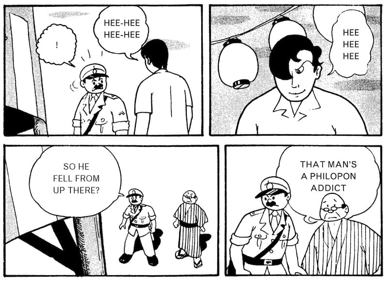 They also became a reliable way to signify moral degeneracy in manga. Drug cartels often appear in kashihon manga from the mid-late 50s. Usually this was simply a natural accompaniment to gangland stories, with the criminals running smuggling operations between China and Japanese ports like Yokohama and Kobe. Such settings are quite frequent in Satō Masaaki’s work, and the drug in question is usually heroine or opium. Methamphetamines belonged to a different social vector. In Matsumoto Masahiko’s stories, for example, Philopon figures alongside alcohol as a marker of individual moral collapse within the context of postwar trauma. The Ni’ichi character, the temperamental neighbor in “The Man Next Door” (“Rinshitsu no otoko,” 1956) who has been driven to the bottle by the death of his family during the war, becomes a Philopon user in “The Incident at Shiranui Village” (“Shiranui mura jiken,” 1956). “That’s Ni’iichi,” explains a rural village girl to her visiting city cousin. “You never know what he’ll do. He’s a Philopon addict. It’s some bad medicine adults inject. When they run out, they get really upset.” Ni’ichi is framed for murder when someone uses a syringe to poison a mean landowner. Ni’iichi then accidentally kills himself when shooting up with another syringe that the same shadowy someone has filled with agricultural pesticide.