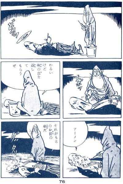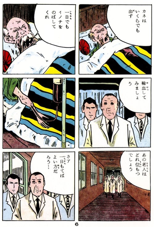 Fortunately, the bank has the donor card on file – a fiction, recycled from “A Family of Ghosts,” that suggests that maybe Mizuki didn’t know blood banks very well, after all. The donor turns out to be the same Rat Man who infected Trunk Nagai with the bloodsucking red tree. We know from other chapters of the series that Rat Man has lived for hundreds of years, not because he is a sponge or an amoeba but rather because he is a yūrei – the same species, that is, whose blood had the exact opposite effect on humans at the beginning of the Kitarō Night Tales series. The Rat Man’s donor card lists his residence as “unknown” and his profession as “jiyūgyō,” meaning freelance or miscellaneous, but which also connotes unemployed. Were this the real world, his profile would fit the description of a Japanese migrant or day laborer, the sort from San’ya whose poorly monitored blood-selling had helped create the blood bank crisis in the first place. If the mafia don becomes greedy post transfusion, it's not because the blood hosts bad personality traits. He was like that to begin with. In the end, tired of being pestered by the don’s men, the Rat Man takes back his blood with a syringe and pump. The don immediately returns to his original geriatric state and dies. Bad people do not deserve good blood.