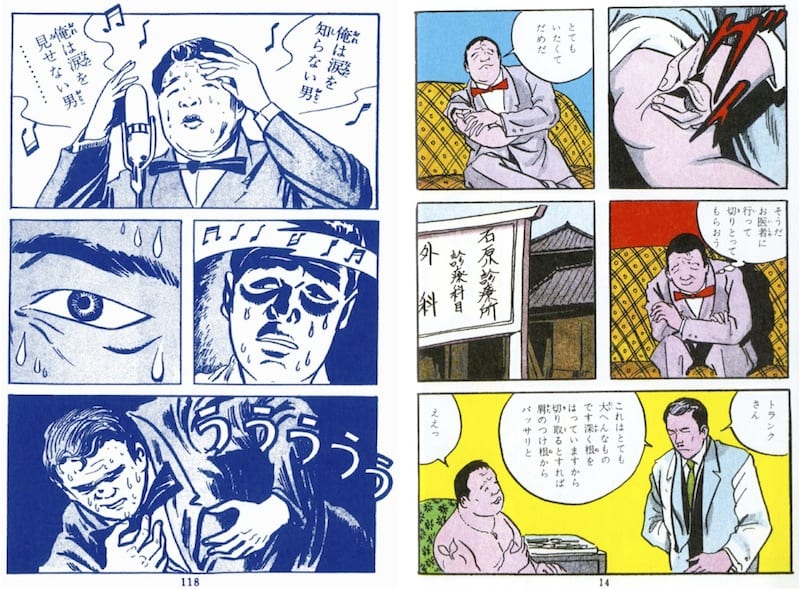 As for Frank Nagai, the inspiration behind Mizuki’s Trunk Nagai, his name does not appear in the rosters of postwar celebrity addicts. As first a truck driver for the American military, then a base-side jazz club singer, and then a fast-rising star in the 50s, one nonetheless suspects ampules of Philopon crossed Nagai’s path even if they never reached his arm. At any rate, the association between drugs and early postwar entertainment was strong enough to easily suggest a connection for a social satirist like Mizuki. It was also heavy methamphetamine use amongst the urban poor and the use of contaminated needles that was identified as a major source of hepatitis within the blood banking system. With a vampire tree growing out of his upper arm at the place where access to the veins is easiest, whose roots are so deep that it cannot be removed without severing the limb, which he inherited by unwitting exposure to indigent filth, who collapses on stage from infection and is turned into gnarled deadwood – Mizuki’s Trunk Nagai neatly ties the passing Philopon Age to the coming Yellow Blood Scare.