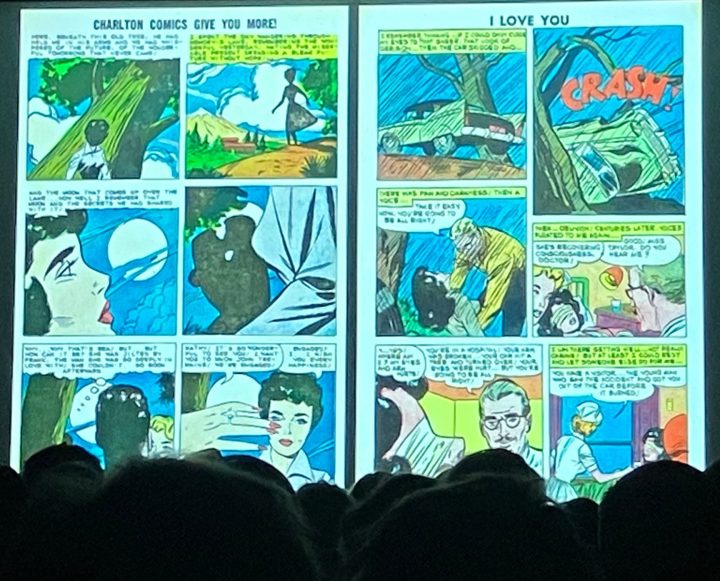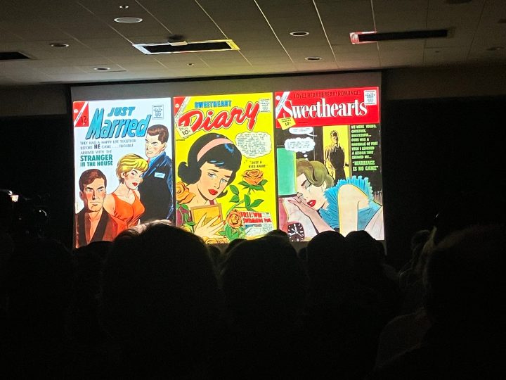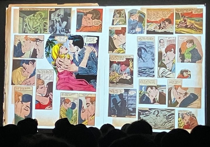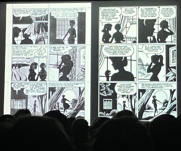 Then the crowd in the basement of the library grew even more for Charles Burns. Duh. I turned in my seat to see the auditorium at full capacity. Obviously these people did not show up for the free donuts. Burns’ set had a couple false starts that weren’t his fault. Dan Nadel was supposed to do the interview but his flight was cancelled, which Brian said was “through no fault of his own” which I would have assumed but for Brian’s need to say it. Anyways, Burns just went through his slides and talked on his own. Last minute changes keep things live. The first resting slide of Burns’ presentation was a bright red color block which saturated the auditorium. It was a cool effect. There were some kind of PA issues and Burns’ voice was too quiet. The audience kept calling “louder”, “more volume”, which reasonably started to get Burns a bit chuffed until someone cut the tension by yelling, “More red!” Everyone laughed, Burns got audible and we were on our way.