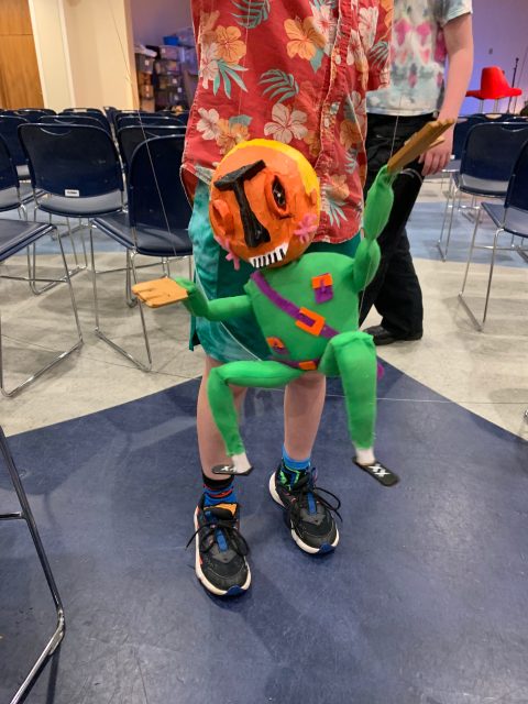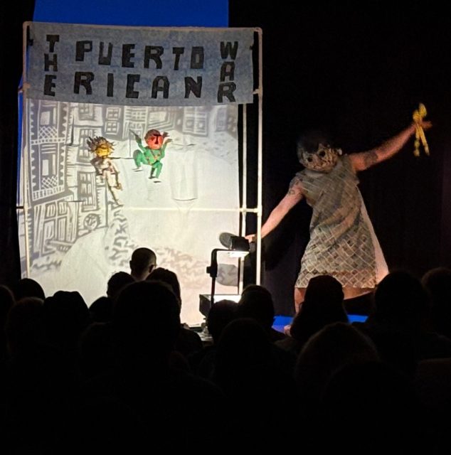 A crowd milling about the opening of Dash Shaw and John Vasquez Mejias’ works on paper, drained into the basement of the Richmond Public Library for Mejias’ itinerant folk performance, The Puerto Rican War. Last I had the chance to see it, I missed it; which I don’t recommend. Formally the show is like a traveling pagan pageant with Noh inspired gestures and DIY resourcefulness; the whole thing is transportable by minivan. The narration, puppetry, live foley, overhead projector, papier mache and cardboard construction orbited together in compliment, no one technique overshadowing another, all under the stylistic glaze of Mejias’ seemingly favoritist thing in the whole wide world: wood cut prints. The moves are deft. It’s just super duper good.