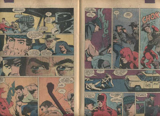 Check out how different the mood is in an issue of Daredevil from years before. Black pages were uncommon then because most comics didn't have the option of full bleed printing processes. The tone of the newsprint lightens the colors and makes the whole composition read differently than the examples above.