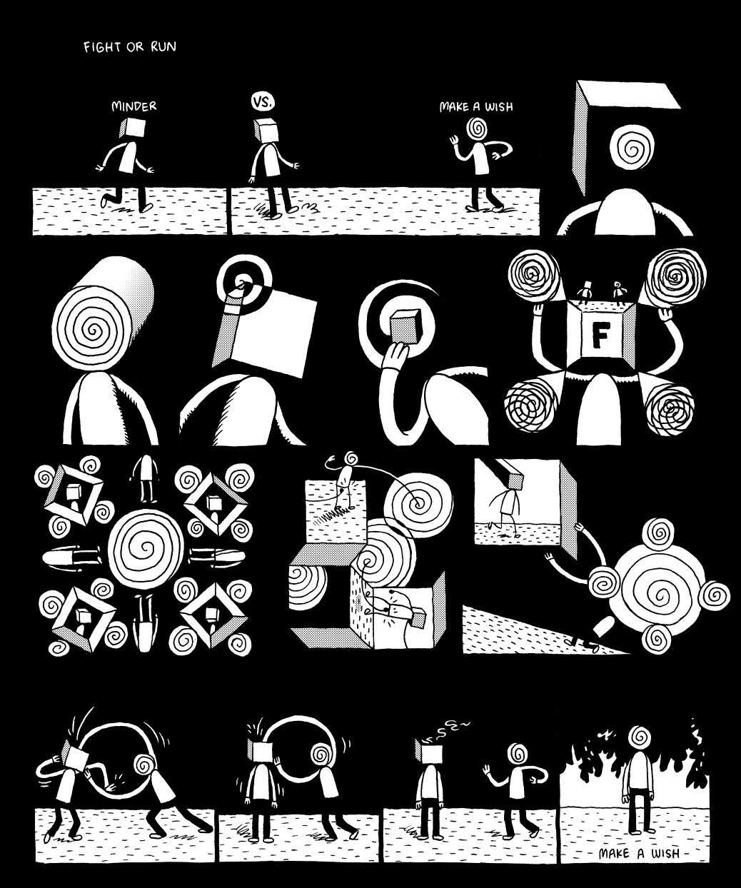 No, I actually think it’s really great. They do kind of “rhyme” in a sense. You sort of have these mirroring spaces… that kind of thing. And as I was re-reading a good bit of your work for this, I was reminded of—there was a Kevin Huizenga sequence I kind of liked, it was in The Wild Kingdom, where all of the diagonals kind of point towards each other. It was just a four-panel square page, and they’re all kind of square panels. But compositionally they’re all pointing inward and then they form this kind of diamond. I just noticed all these compositional elements that had sort of a “rhyming-together” in that way.