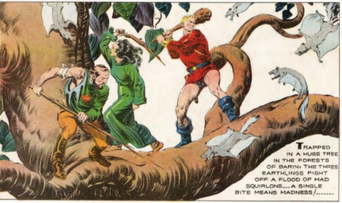 The first volume covers every comic from Jan. 7, 1934, to April 18, 1937, and there's never a real break in the action except for the implied ones for the original readers, as they had to wait a week between strips to figure out what would happen next. The pacing moves fast despite that- in twenty-seven weeks, Flash goes from being the unwilling servant of the Sea Queen to fighting off those killer squirrels in the forest kingdom. A lot happened between those points, including multiple allegiance shifts and even a war, yet the sequence of events remains quite logical in my memory.