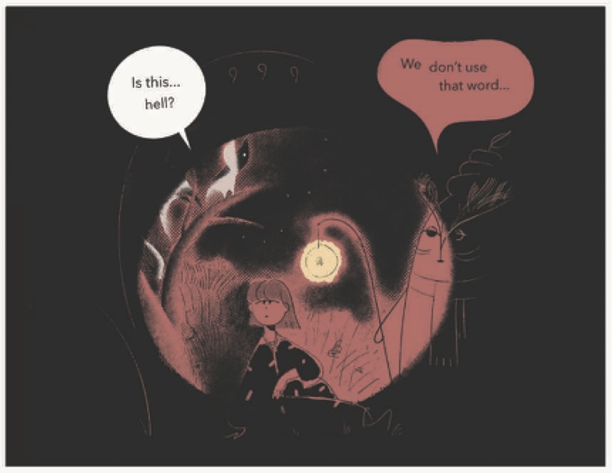 I emphasize “relief” here, because while the book contains a lot of humor of different stripes, its primary tone (visually and narratively) is somewhat alarmingly bleak. Our hero returns to a world she never loved, and has to live with herself and a ghostly abstraction of herself, and the spirit-shadowed world in which she lives doesn't make her happier, more interested, or even more frightened. It's just another chore to deal with. By the time the book reaches its stark conclusion, the black panels seem less like a kind of padding and more like a relief from the relentlessness of the protagonist's own emptiness.