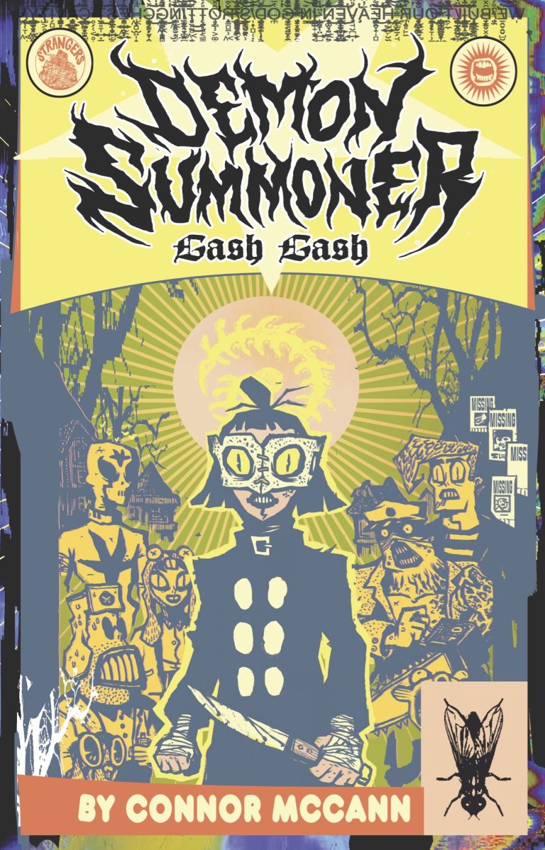 I could not read Connor McCann’s Demon Summoner Gash Gash, newly published by Strangers, without thinking of Vasquez’s Johnny The Homicidal Maniac. Listed on his back cover are his chosen reference points: Devilman, Cormac McCarthy, and Gummo; and to all that I say, “Get the fuck out of here if you’re trying to act like you weren’t wearing a JTHM shirt at least once a week for a full year of high school.” Look at the front cover, with the buckle around the main character’s neck, and the long stabby knife streaked with blood made of the same marks as the bandages wrapped around the hand that grips its hilt.