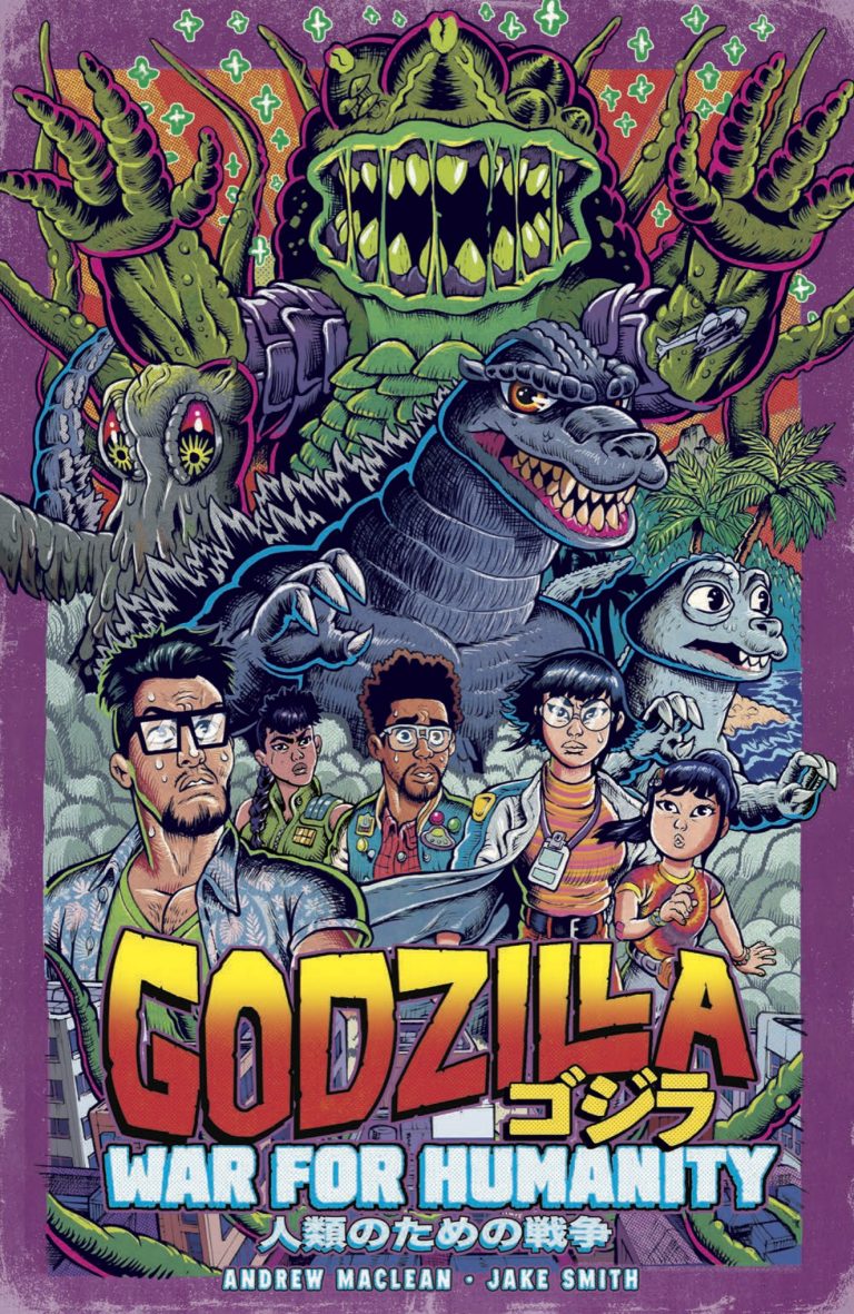 Which brings us to the subject of our review today, a Godzilla story that may just have flown under the radar in the context of the previous four paragraphs of big lizard merchandising. It’s called War for Humanity, and it initially shipped as a five-issue series from August of 2023 through to May of this year. Written by Andrew MacLean with art by a man named Jake Smith, and it is one of the most gorgeous comics I’ve seen in a good while.