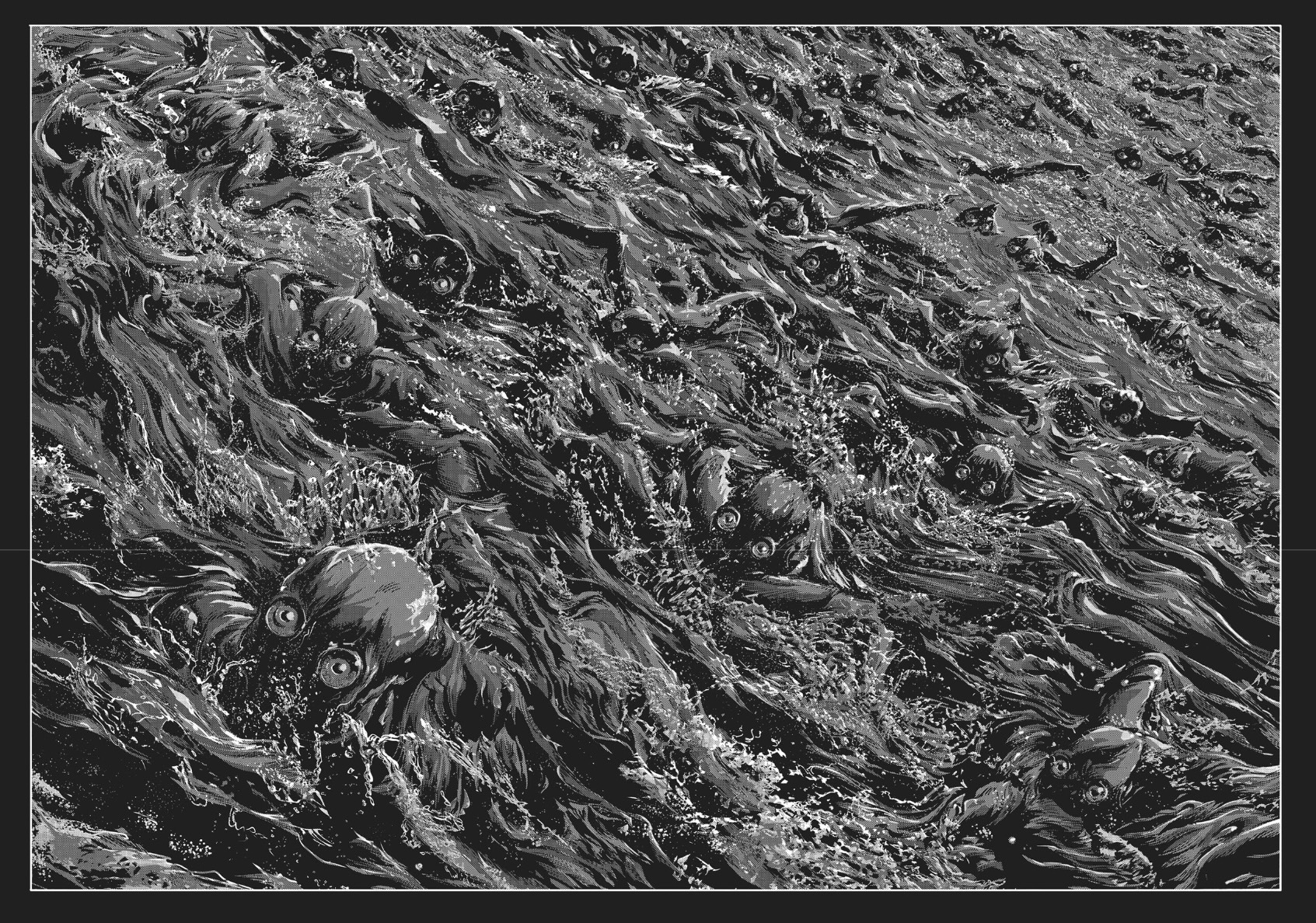 Still, even in a story that doesn’t fully fit Tanabe’s aesthetic,4 one cannot help but surrender to the overwhelming sensuality of it all. You find yourself, much like the narrator, drowning in the sheer presence of these tablatures. It’s true that there is nothing quite as scary as what each of us can imagine to ourselves, but it is also true that Tanabe is much better at visualization than most. His is a gift of scale, which is a subject Lovecraft deals with often: the place of man, both as a species and as an individual, in a cosmos far bigger than he can conceive. These endless stretches of pages with their countless creatures help to establish the right mood of human insignificance. When Tanabe draws, you can certainly grasp your place in Lovecraft's world - another small thing, to be swept off by the waves.