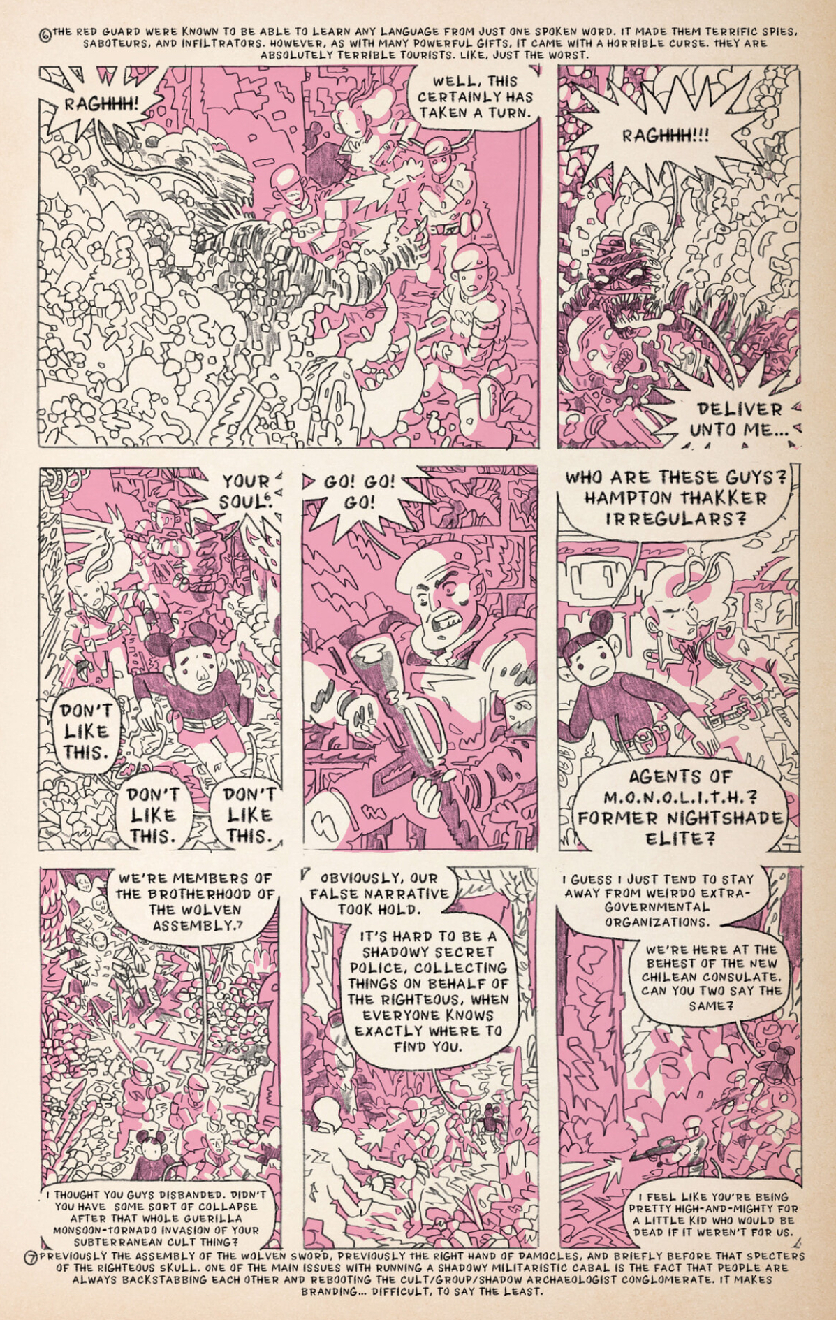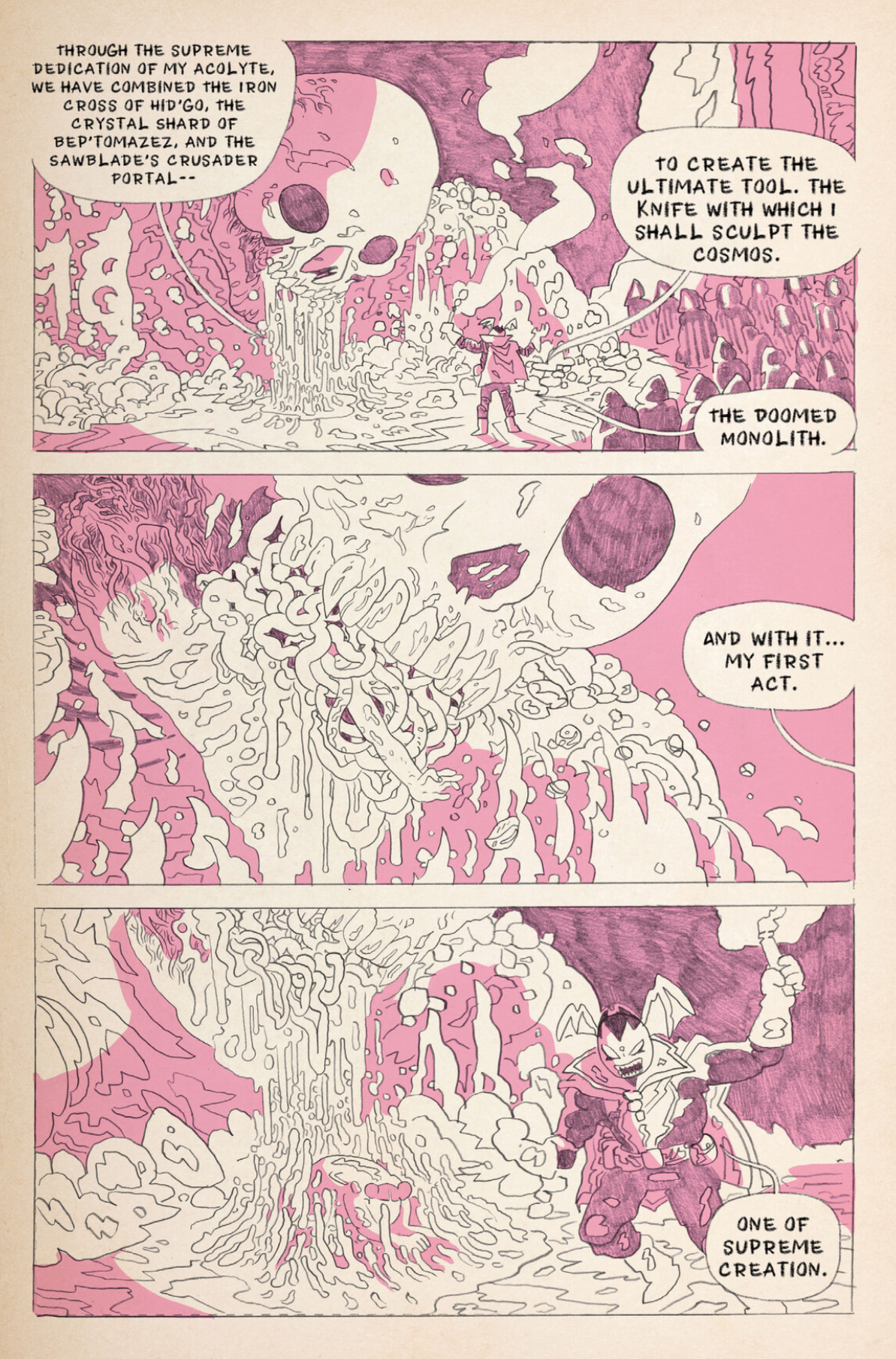 It’s a dense read. The book alternates between sections of comics and sections of prose, with the purpose of the latter (roughly 100 pages of the book in whole) being to provide gradual context and insight into the former. The comics are often bewilderingly dense, overstuffed with detail, rewarding a deliberate reading speed. The extended prose sequences that buffer the comics also act as a brake, forcing the reader to progress at a more stately pace than they might otherwise.