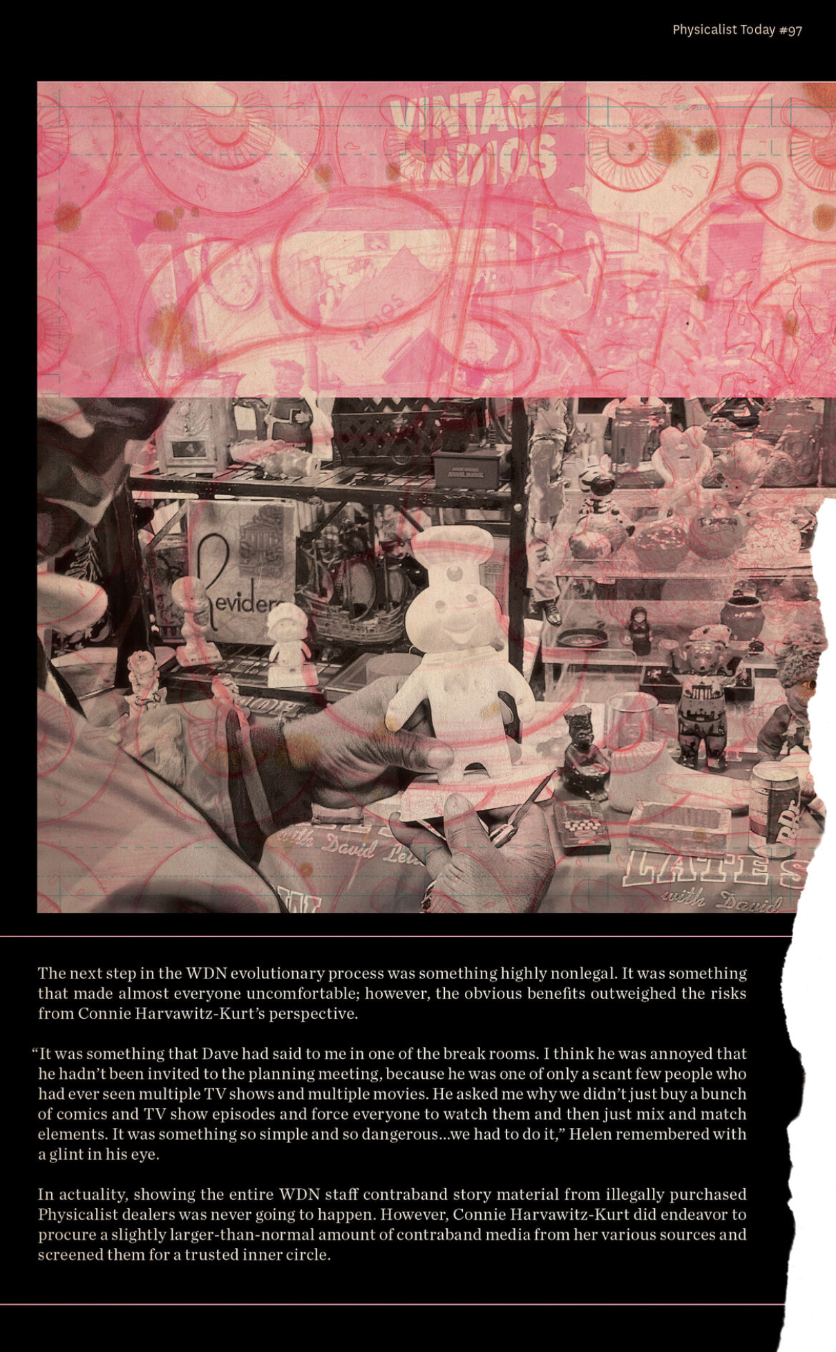 A thought that occurred to me throughout the process of reading: would the comics sections stand on their own without the scaffolding of the prose to buttress? I have no ready answer to this, but it’s always worth asking for any polyglot text: what is gained and what is lost when different modes mingle? In between the comics we are given excerpts of articles from "Physicalist Today," a future magazine devoted to the collection of physical objects from the past. A wholly illegal business, at least in the present of the story’s narrator. The reclusive mastermind behind "Mary Tyler MooreHawk," himself named Dave Baker, is a “physicalist” of no small renown, and it’s from those historical influences that the shape of the fictional story emerges.
