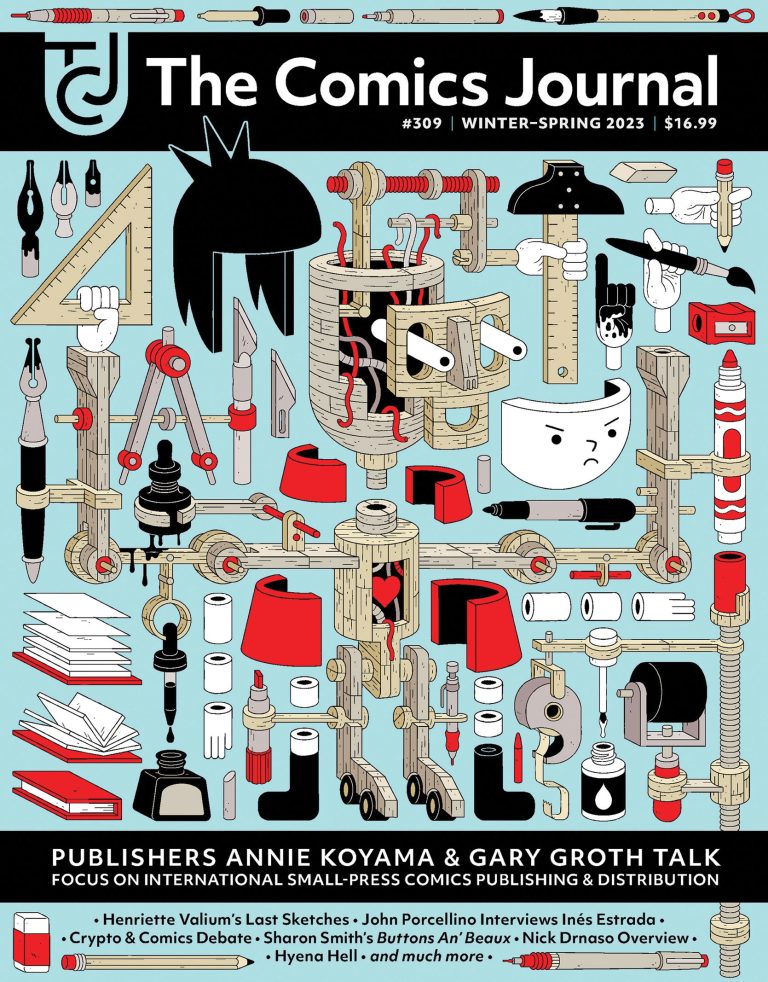 From the trenches of independent/small press comics publishing, two art comics publishers talk — Gary Groth (Fantagraphics) interviews Annie Koyama (Koyama Press). This issue of the award-winning magazine focuses on international small press comics publishing and distribution.John Porcellino, the King Cat of zines and carefully observed autobio comics, speaks to Inés Estrada, cartoonist (Alienation) and publisher/distributor of comics and zines in Mexico. Also: a gallery of Henriette Valium’s work, from his drawing table at the time of his passing. Cartoonist (Beta Testing the Ongoing Apocalypse) and publisher (Uncivilized Press) Tom Kaczynski debates comics critic Alin Rautoiu about crypto and comics. And: a biography/gallery of Sharon Smith and her classic comic strip, Button ‘n’ Beax; a brand-new comic from Juniper Kim; a deep dive into Nick Drnaso’s oeuvre; a deconstruction of the Image comics aesthetic; a spotlight on Hyena Hell; the debut of a new columns focusing on avant-garde European comics, and much, much more.