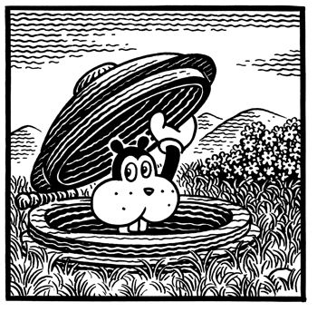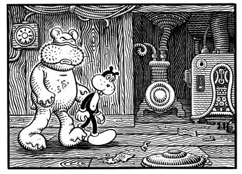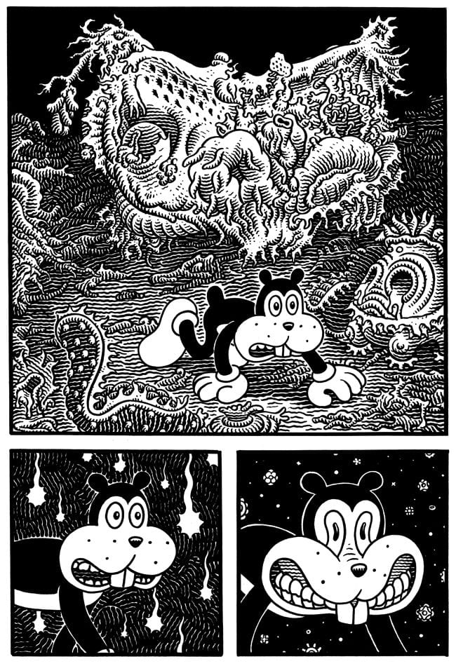 WOODRING: When I was real little, I did drawings of the things I saw that scared me. I must have seen a mouse that got its head clawed off by a cat or something, because I had this recurring image of a headless animal, sometimes it was a big animal, like a bison. If I saw a bird or a bison I would imagine it with its head missing. Sometimes I would more than imagine it—I would see it and I would draw those things. I drew this little man made of electricity who was my persecutor. I would try to draw him in such a way that the drawing would have the intensity he had when I saw him. It was in his eyes. He had these blank eyes that scared me so much that I was almost sorry I when I captured them in a drawing. But then, at the same time, I was glad I did it, because it I felt like it showed that I was in control of the situation. I would just draw things that scared me. It upset my parents to no end. They really thought I was nuts, and it was the days before children were routinely sent off to psychologists or given drugs.. I’m sure if Ritalin and that stuff had been around, my folks would have gotten me on drugs as quickly as possible. Instead, they just despaired and withdrew from me.
