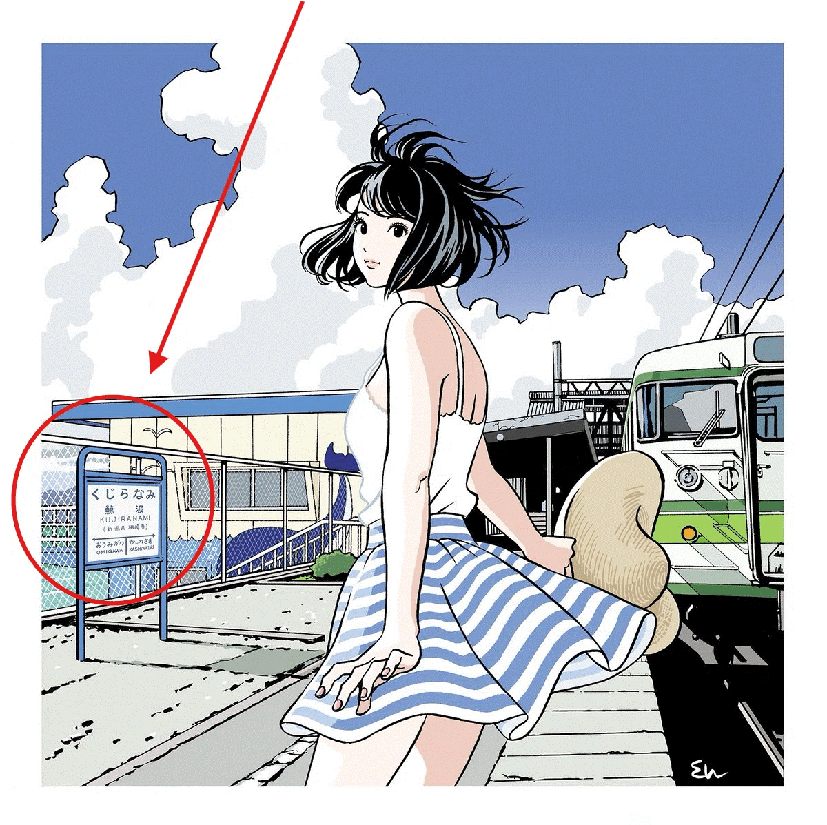 The girl on Eguchi’s jacket exists somewhere between the real and the imagined. Behind her, the station sign reads Kujiranami — a seaside stop on the Japan Sea coast, celebrated as the birthplace of sea-bathing in the region. The record’s release in 2018 happened to coincide with the station’s 130th anniversary.