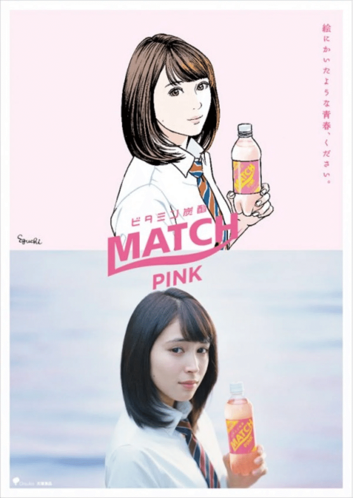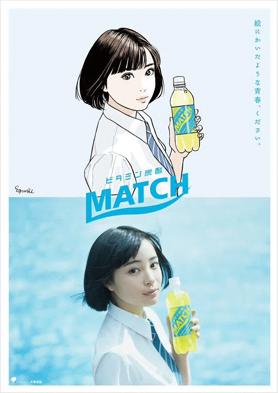 Another case shows how Eguchi blurs the line between reality and fiction. In 2015, he designed an advertising poster for MATCH, a soft drink produced by one of Japan’s major beverage companies. At the time, a pair of teenage idols appeared in the TV commercials under the slogan: “That picture-perfect youth, please.”