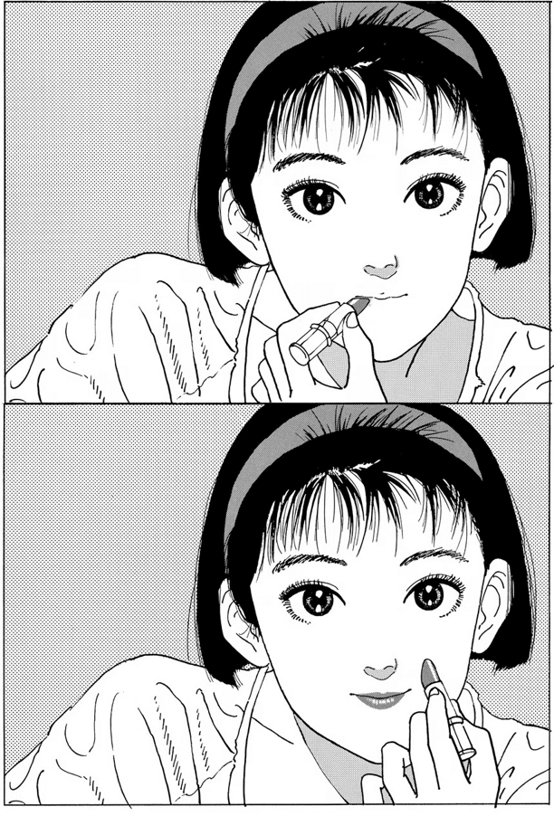 His 1985–86 series Paparinko Story — left unfinished and never collected in book form — appeared in Big Comic Spirits, a magazine aimed at young men in their early twenties. The art was meticulous, bordering on photographic, yet his girls didn’t feel like the eroticized bishōjo (“pretty girl”) types common in mainstream manga. Instead, by borrowing the visual language of fashion spreads — the tilt of a wrist, the way fabric catches light — he built an image of beauty that women could relate to rather than consume.