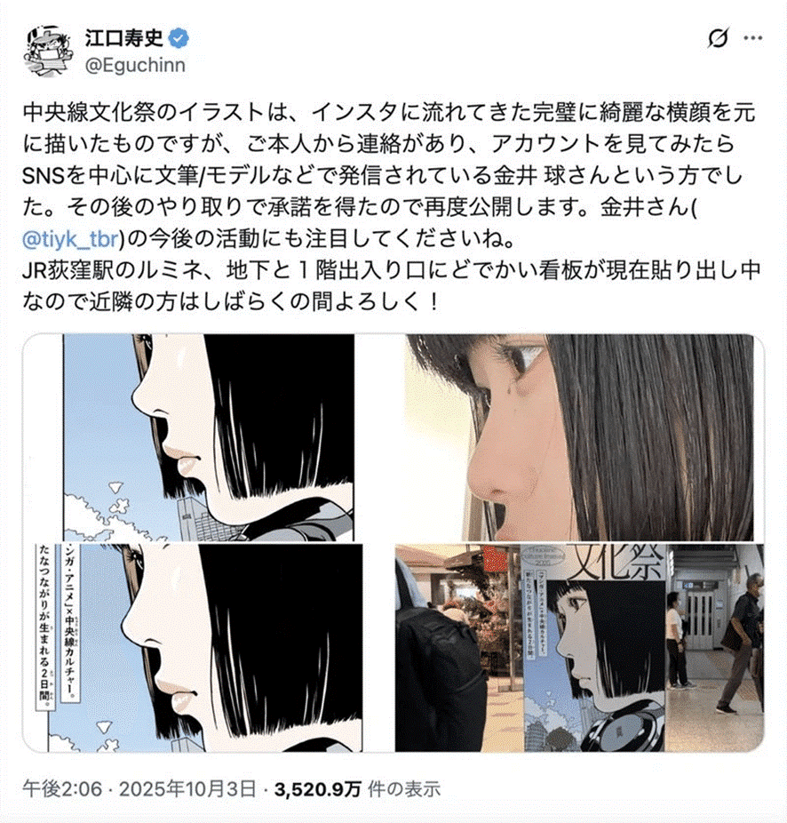 A week later, on Oct. 3, a notice appeared on Eguchi’s official X account. It read, in essence: “The illustration for the Chuo Line Culture Festival was based on a photo of a woman’s profile I happened to see on Instagram. I didn’t realize she was a professional model until she contacted me recently. I have since received her post-facto approval for the illustration.”