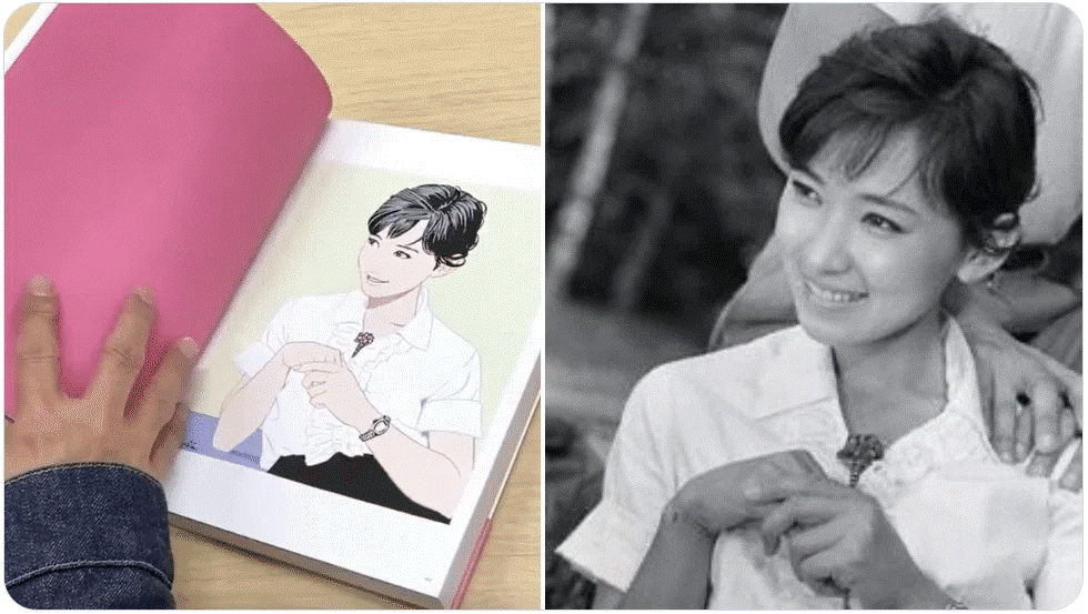 Take the opening image from his 2021 art book Kanojo (She): a portrait of actress Izumi Ashikawa (b. 1935), created to mark her 65th anniversary in the film industry. After the 2025 scandal, someone online paired the drawing with its source photo and accused him of plagiarism. But if you look closely, the difference is the whole story: his lines strip away photographic realism and rebuild it as something more luminous, more distilled.